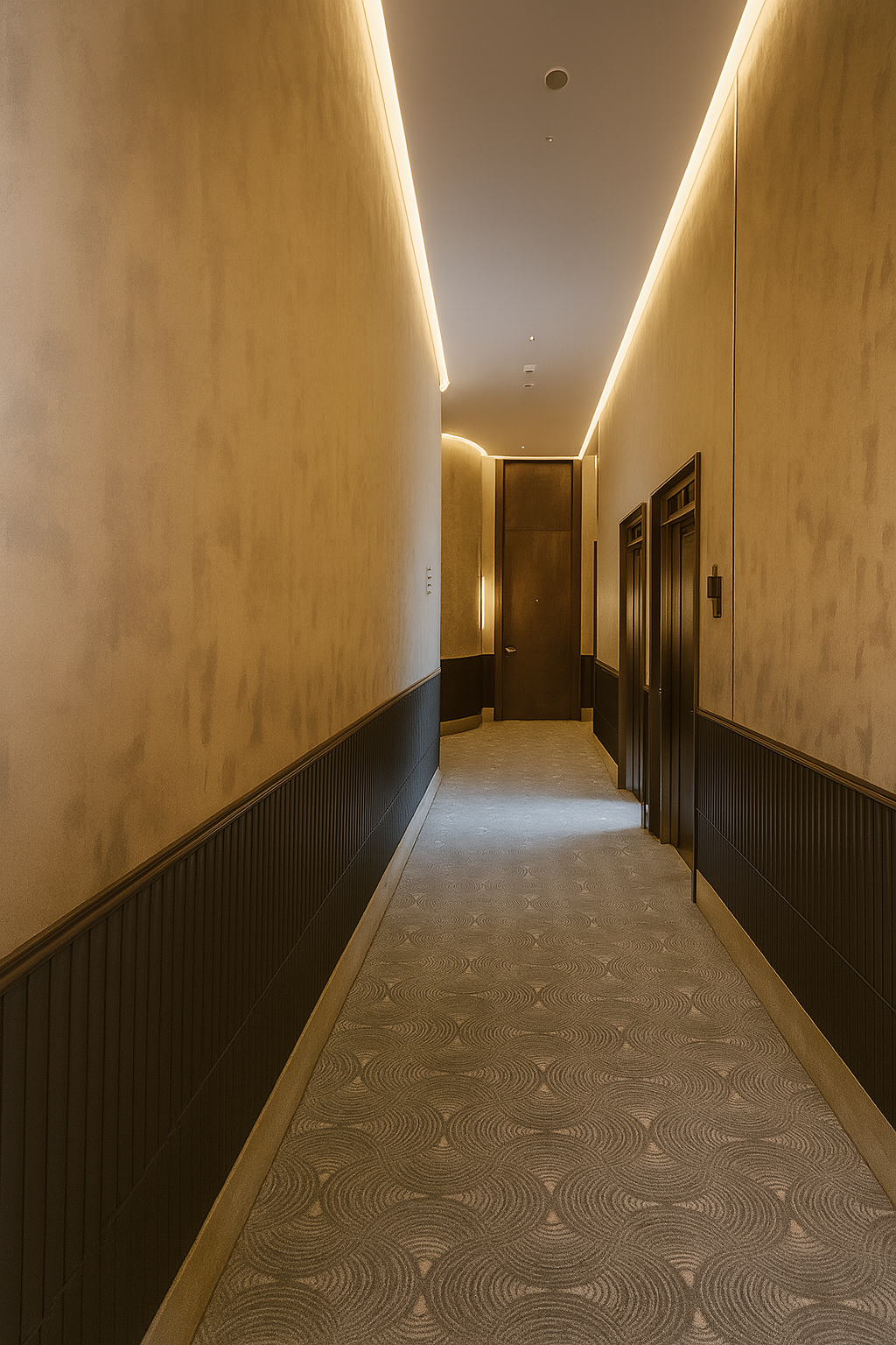 La moqueta, fabricada en lana virgen, destaca por su diseño sobrio y su perfecta integración en los pasillos del hotel. Su acabado aporta textura, calidez y un toque distintivo. Nuestra intervención en este proyecto reafirma nuestra implicación en proyectos hoteleros de alto nivel, ofreciendo soluciones textiles que fusionan estética, durabilidad y funcionalidad. Este trabajo refleja el valor de la colaboración entre firmas especializadas en diseño de interiores y nuestra capacidad de adaptar cada propuesta a las necesidades concretas del espacio.